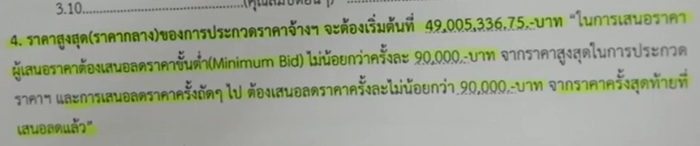 และในข้อ 4. ระบุอย่างชัดเจนว่า ราคาสูงสุด(ราคากลาง)ของการประกวดราคาจ้างฯ จะเริ่มต้นที่ 49,005,336.75 บาท “ในการเสนอราคาผู้เสนอราคาต้องเสนอลดราคาขั้นต่ำ(Minimum Bid) ไม่น้อยกว่าครั้งละ 90,000 บาท จากราคาสูงสุดในการประกวดราคาฯ และการเสนอลดราคาครั้งถัดๆไป ต้องเสนอลดราคาไม่น้อยกว่า 90,000 บาท จากราคาครั้งสุดท้ายที่เสนอลดแล้ว"