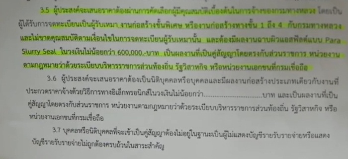 ขณะที่ เอกสารขอบข่ายงานหรือ TOR ระบุในข้อ 3.5 ว่า ผู้ประสงค์จะเสนอราคาต้องผ่านการคัดเลืิอกผู้มีคุณสมบัติเบื้องต้นในการจ้างของกรมทางหลวง โดยเป็นผู้ได้รับการจดทะเบียนเป็นผู้รับเหมา งานก่อสร้างขั้นพิเศษ หรืองานก่อสร้างทางขั้น 1 ถึง 4 กับกรมทางหลวง และไม่ขาดคุณสมบัติตามเงื่อนไขในการจดทะเบียนผู้รับเหมานั้น และต้องมีผลงานฉาบผิวแอสฟัลท์แบบ Para Slurry Seal ในวงเงินไม้่น้นอยกว่า 600,000 บาท เป็นผลงานที่เป็นคู่สัญญาโดยตรงกับส่วนราชการ หน่วยงานตามกฎหมายว่าด้วยระเบียบบริหารราชการส่วนท้องถิ่น รัฐวิสาหกิจ หรือหน่วงยงานเอกชนที่กรมเชื่อถือ