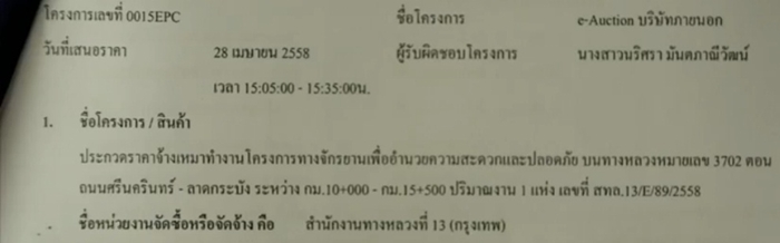 ต่อมา สถานีโทรทัศน์ PPTV ได้นำเสนอข้อมูลโครงการดังกล่าว พบว่า หน่วยงานที่จัดซื้อหรือจัดจ้าง คือ สำนักงานทางหลวงที่ 13 (กรุงเทพ) ระบุเลขที่โครงการ 0015EPC โดยวันที่เสนอราคา คือ 28 เม.ย. 58 มีผู้รับผิดชอบโครงการชื่อ นางสาวนริศรา มันตภาณีวัฒน์ และโครงการดังกล่าวเป็นการประกวดราคาแบบ E-Auction