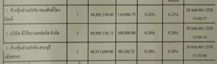 นอกจากนี้ มีบริษัทเอกชนที่เข้าร่วมเสนอราคา จำนวน 3 ราย ได้แก่ 1.บริษัท ซีโก้ทรานสปอร์ต จำกัด เสนอต่ำกว่าราคากลาง 100,000 บาท 2.ห้างหุ้นส่วนจำกัด ทนงศักดิ์วิศวภัณฑ์ เสนอต่ำกว่าราคากลาง 110,006.75 บาท(ผู้รับจ้าง) และ 3.ห้างหุ้นส่วนจำกัด สระบุรีวณิชชากร เสนอต่ำกว่าราคากลาง 90,336.75 บาท ตามลำดับ ซึ่งเป็นการเสนอราคาห่างกันไม่ถึง 5 นาที