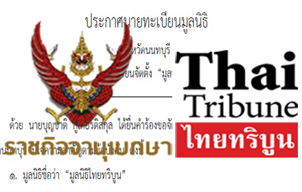 ผู้สื่อข่าวสำนักข่าวอิศรา www.isranews.org รายงานว่า เมื่อวันที่ 8 ต.ค. 58 ประกาศราชกิจจานุเบกษา นายทะเบียนมูลนิธิ จังหวัดนนทบุรี เรื่อง จดทะเบียนจัดตั้ง “มูลนิธิไทยทริบูน” โดย นายบุญชาติ กู้เกียรติสกุล ได้ยื่นคำร้องขอจัดตั้งมูลนิธิไทยทริบูน ต่อนายทะเบียนมูลนิธิจังหวัดนนทบุรี มีใจความสำคัญตามข้อบังคับ ดังนี้