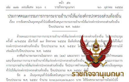 สำนักข่าวอิศรา www.isranews.org รายงานว่า ราชกิจจานุเบกษา 20 ต.ค. 58 เผยแพร่ประกาศคณะกรรมการการกระจายอำนาจ ให้แก่ องค์กรปกครองส่วนท้องถิ่น เรื่อง การจัดสรรเงินอุดหนุนทั่วไปเพื่อสนับสนุนการกระจายอำนาจให้แก่องค์กรปกครองส่วนท้องถิ่น ปีงบประมาณ พ.ศ. 2559