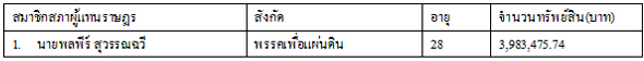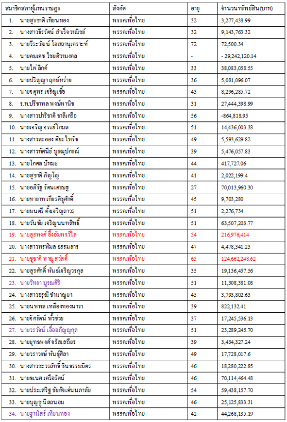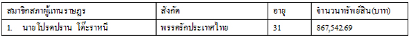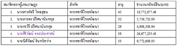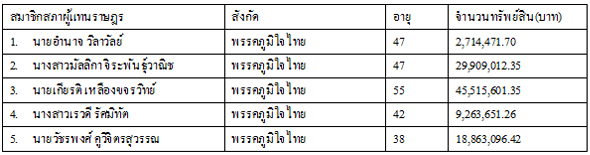 1.นายสุรพงศ์ อึ้งอัมพรวิไล พรรคเพื่อไทย อายุ 54 ปี จำนวนทรัพย์สิน 216,976,414 บาท