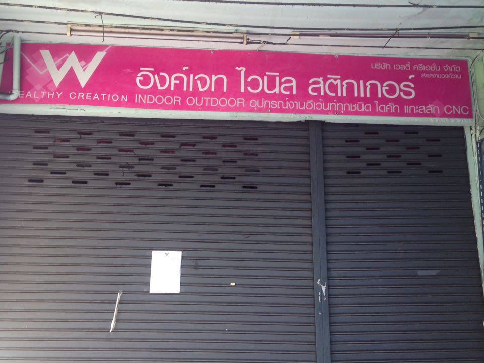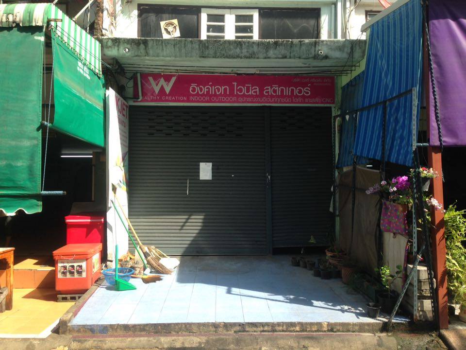 พร้อมข้อความว่า “อิงค์เจท ไวนิล สติ๊กเกอร์ Indoor Outdoor อุปกรณ์อีเวนท์ทุกชนิด ไดคัท แกะสลัก CNC” และประตูมู่ลี่เหล็กปิด