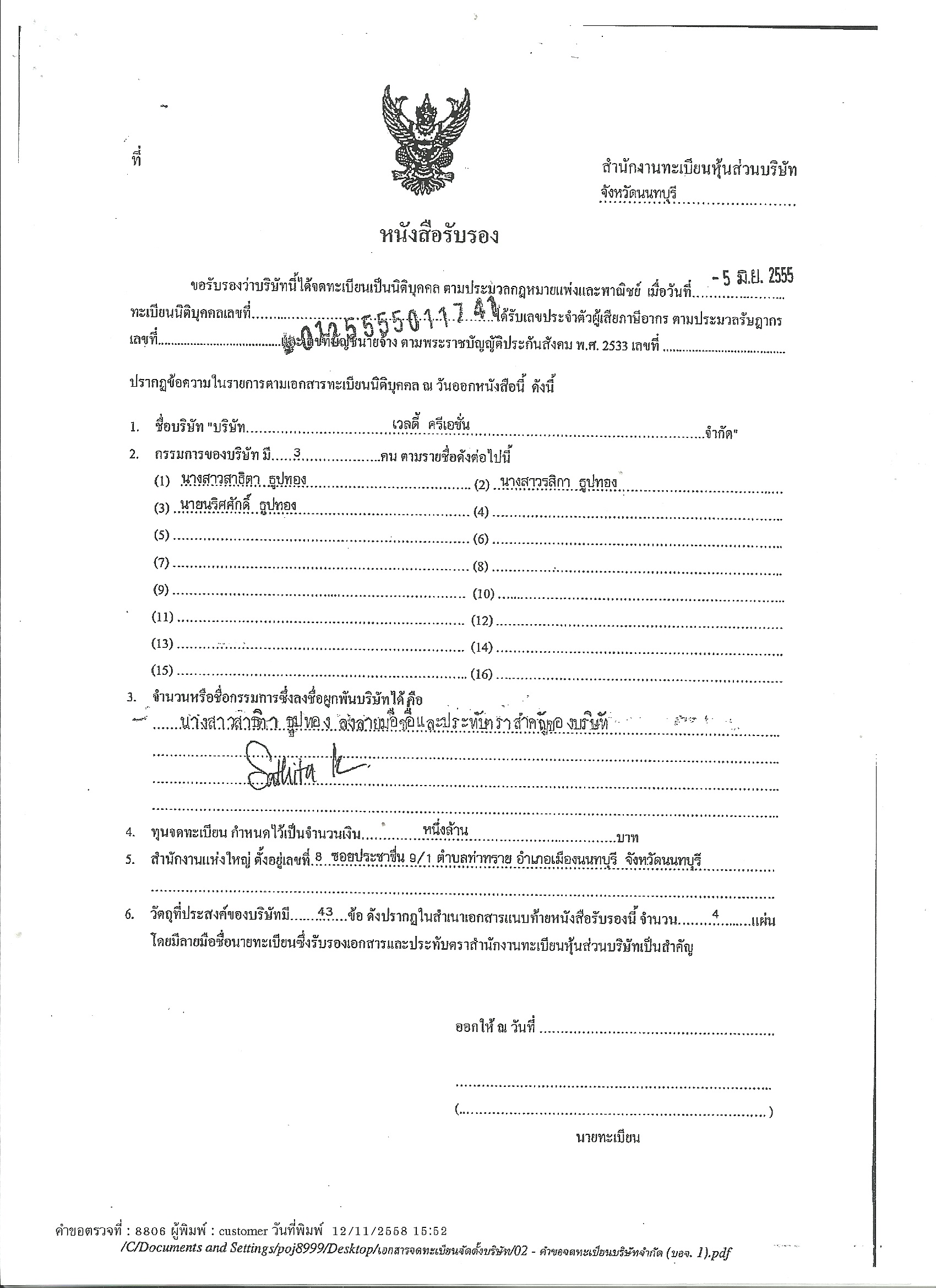 2. เป็นที่อยู่ตามบัตรประชาชนของ นางสาวสาธิตา ธูปทอง ผู้ถือหุ้นใหญ่ บริษัท เวลตี้ ครีเอชั่น จำกัด และ บริษัท โอบามาเก้ากรุ๊ป จำกัด
