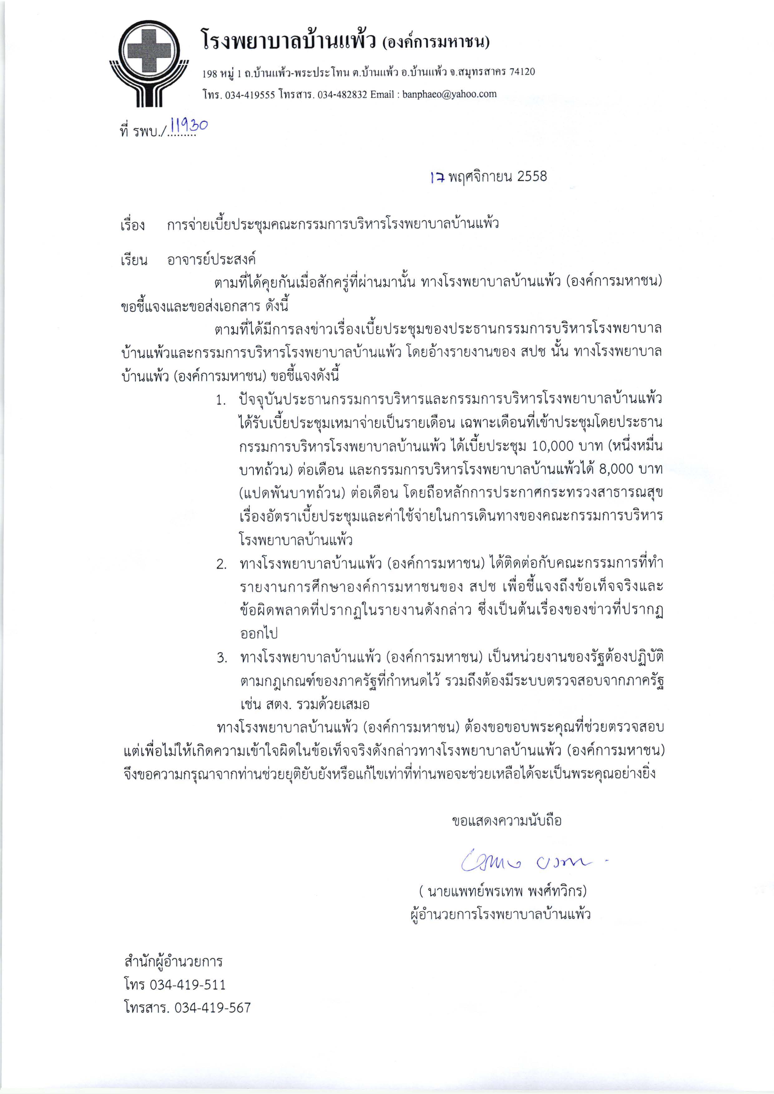 ตามที่ได้มีการลงข่าวเรื่องเบี้ยประชุมของประธานกรรมการบริหารโรงพยาบาลบ้านแพ้วและกรรมการบริหารโรงพยาบาลบ้านแพ้ว โดยอ้างรายงานของ สปช. นั้น ทางโรงพยาบาลบ้านแพ้ว (องค์การมหาชน) ขอชี้แจงและขอส่งเอกสาร ดังนี้