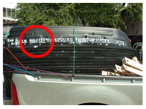 หมายเหตุ : ในวงกลมสีแดงคือคำว่า "อาร์เคเค" จากข้อความที่ใช้สีสเปรย์พ่นข้างเรือว่า "ปันน้ำใจช่วยเหลือผู้ประสบอุทกภัย โดยกลุ่มเจมูติน อาร์เคเค" (ตกแต่งภาพโดย ฝ่ายศิลป์ ทีมข่าวอิศรา)