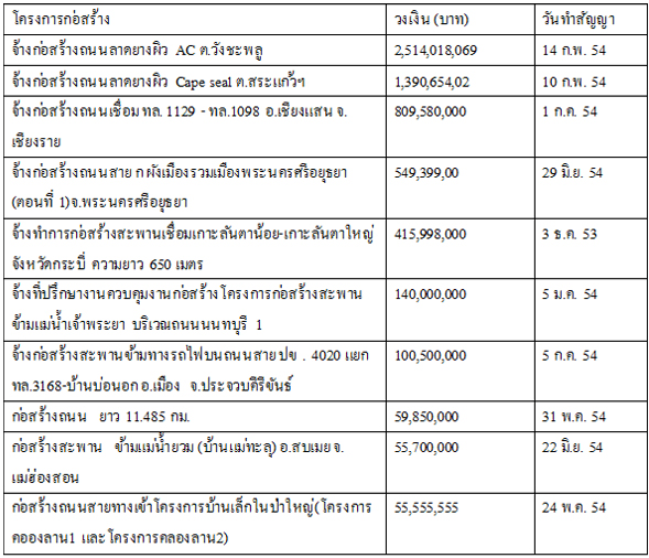 ล่าสุด ปี 2554 โครงการรับเหมาที่มีวงเงินสูงสุด ได้แก่ (ดูตาราง)