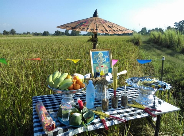 วรรณลพ ถนอมผล ผู้ใหญ่บ้าน หมู่ที่ 1 บ้านวังชะนาง ตำบลท้ายดง อำเภอ วังโป่ง จังหวัดเพชรบูรณ์ วัย 49 ปี พูดคุยกับเรา ขณะยืนหลบแดดอยู่บนคันนา หลังเสร็จจากการร่วมพิธีเชิญแม่โพสพขึ้นจากนา และลงแขกเกี่ยวข้าวไรซ์เบอรรี่ปลอดสารพิษแปลงนาของผู้ใหญ่สุมนทา