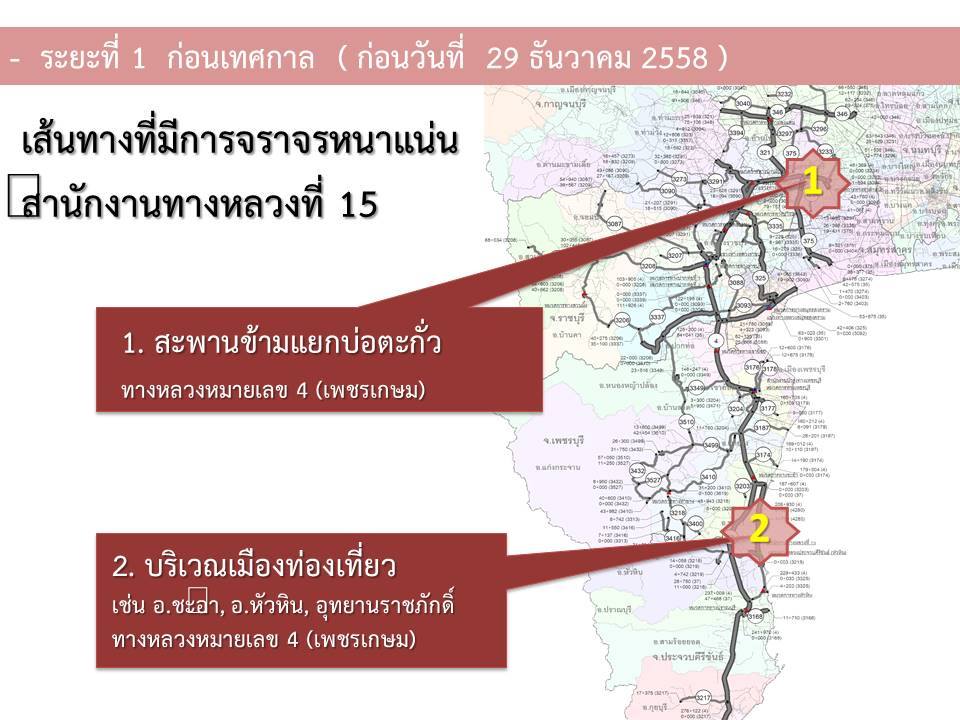เส้นทางลงภาคใต้ ช่วงสะพานข้ามแยกบ่อตะกั่ว และบริเวณเมืองท่องเที่ยว เช่น อ.ชะอำ อ.หัวหิน อุทยานราชภักดิ์ การซ่อมถนนยังไม่เสร็จ แต่กรมทางหลวงจะคืนผิวจราจรให้ก่อนเทศกาล