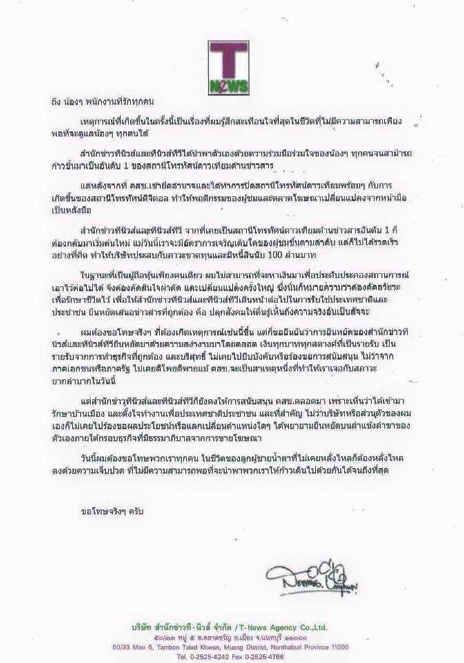 ขณะที่มีรายงานข่าวแจ้งว่า นายสนธิญาณ ชื่นฤทัยในธรรม ผู้บริหารสำนักข่าวทีนิวส์ ได้ออกแถลงการณ์ขอโทษและชี้แจงข้อเท็จจริงให้พนักงานทุกคนรับทราบ โดยระบุว่า ได้รับผลกระทบจากการเกิดขึ้นของทีวิดิจิทัล มีปัญหาขาดทุนกว่า 100 ล้านบาท ทำให้ต้องยอมตัดอวัยวะเพื่อรักษาชีวิต