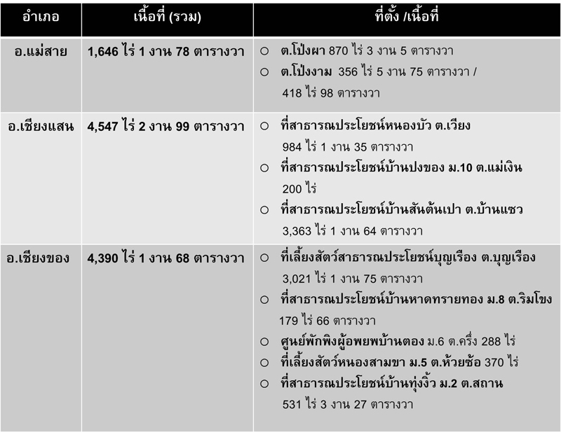 โดย กนพ.ได้เห็นชอบให้พื้นที่ 3 อำเภอชายแดน จ.เชียงราย คือ อ.แม่สาย อ.เชียงแสน และ อ.เชียงของ เป็นพื้นที่จัดตั้งพร้อมกันทั้ง 3 อำเภอ ทางจังหวัดได้เตรียมความพร้อมรองรับด้วยการตั้งคณะกรรมการจำนวน 3 ชุด คือ คณะกรรมการประสานงานจัดตั้งเขตพัฒนาเศรษฐกิจพิเศษ คณะทำงานยกร่างแผนแม่บทเขตพัฒนาเศรษฐกิจพิเศษ และคณะทำงานสนับสนุนเขตพัฒนาเศรษฐกิจพิเศษ รวมทั้งว่าจ้างบริษัทปัญญา คอนซัลแตนท์ จำกัด จัดทำร่างแผนแม่บทและแผนงานโครงการตั้งแต่ มี.ค.-ต.ค. ปัจจุบันจังหวัดได้นำเสนอพื้นที่เพื่อให้ทาง กนพ.และรัฐบาลนำไปพิจารณาจัดตั้งเขตพัฒนาเศรษฐกิจพิเศษตามโครงการแล้วทั้ง 3 อำเภอ