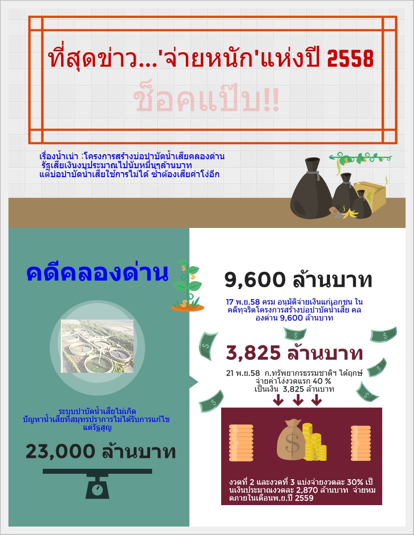 ปี 2559 จึงน่าจับตาการทำหน้าที่ของกระทรวงทรัพยากรธรรมชาติและสิ่งแวดล้อม (กรมควบคุมมลพิษ) ซึ่งรับผิดชอบการดำเนินคดีที่เกี่ยวเนื่องกับโครงการฯ นี้ จะสามารถรักษาผลประโยชน์สูงสุดของทางราชการเร่งรัดการดำเนินการเพื่อให้บุคคลที่รับผิดชอบหรือเกี่ยวข้องชดใช้ค่าเสียหายที่เกิดขึ้นได้หรือไม่