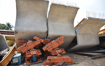 ในการยกชิ้นส่วนสะพานใช้ตัวโครงเหล็กเลื่อนมีที่รองรับ วางบนฐานที่อยู่บนตอม่อ ร่วมกับ หูช้าง (Bracket) เพื่อช่วยรับน้ำหนักบรรทุก สันนิษฐานว่าขณะที่โครงเหล็กเลื่อน กำลังยกชิ้นส่วนสะพานอยู่นั้นโครงสร้างชั่วคราวอาจทรุดเอียงไปด้านหนึ่ง จึงทำให้โครงเหล็กเลื่อนเสียเสถียรภาพและพลิกร่วงลงมา ทำให้ชิ้นส่วนสะพานหรือเซ็กเมนท์ที่ห้อยติดไว้ใต้โครงเหล็กเลื่อน ร่วงหล่นลงมาด้วย ขณะเดียวกันปลายของฐานตอม่ออีกต้นหนึ่งที่สร้างเสร็จแล้วก็ถูกดึงจนหักไปด้วย คาดว่าน่าจะเป็นความผิดพลาดในขณะก่อสร้าง