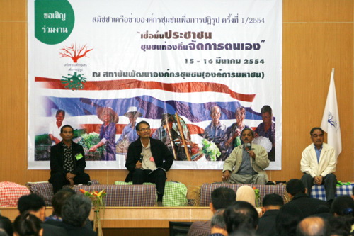 วันที่15 มี.ค. 54 ที่สถาบันพัฒนาองค์กรชุมชน (พอช.) จัดเวทีสมัชชาเครือข่ายองค์กรชุมชนเพื่อการปฏิรูป “เชื่อมั่นประชาชนชุมชนท้องถิ่นจัดการตนเอง”โดยนายไพโรจน์ พลเพชร ผู้แทนภาคประชาสังคม กล่าวว่าการจัดการตนเองไม่สามารถทำได้โดยชุมชน 100 เปอร์เซ็นต์ เพราะสังคมไม่สามารถหลุดจากการรวมศูนย์อำนาจได้ ยังถูกกำหนดโดยกลไกทุนตลาดและการมือง นี่คือสิ่งท้าทายว่าหากจะสู้อาจต้องไปถึงการมีกฎหมายที่ชัดเจนเรื่องการจัดความสัมพันธ์ของอำนาจรัฐให้เอื้อต่อการจัดการตนเอง