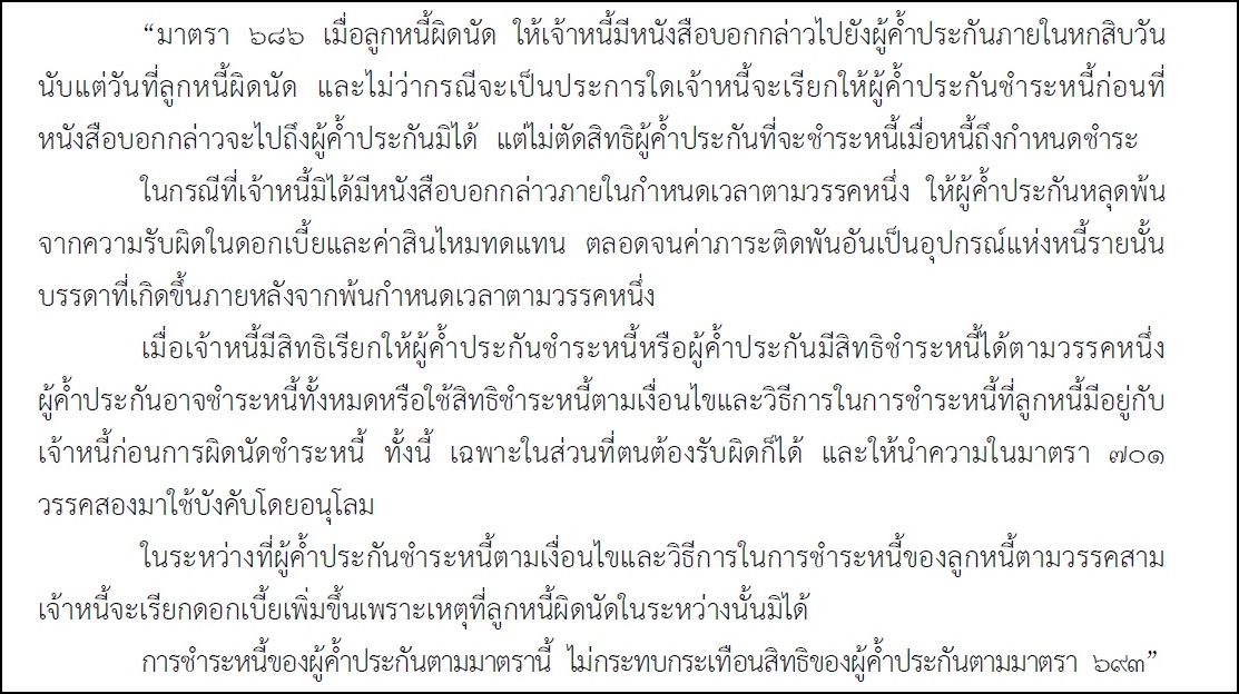 เมื่อมาดูพระราชบัญญัติ แก้ไขเพิ่มเติมประมวลกฎหมายแพ่งและพาณิชย์ (ฉบับที่ 20) พ.ศ.2557 คือฉบับหลักได้มีการแก้ไขและคุ้มครองผู้ค้ำประกันอยู่แล้ว โดยเฉพาะใน มาตรา 686 ที่ระบุว่า