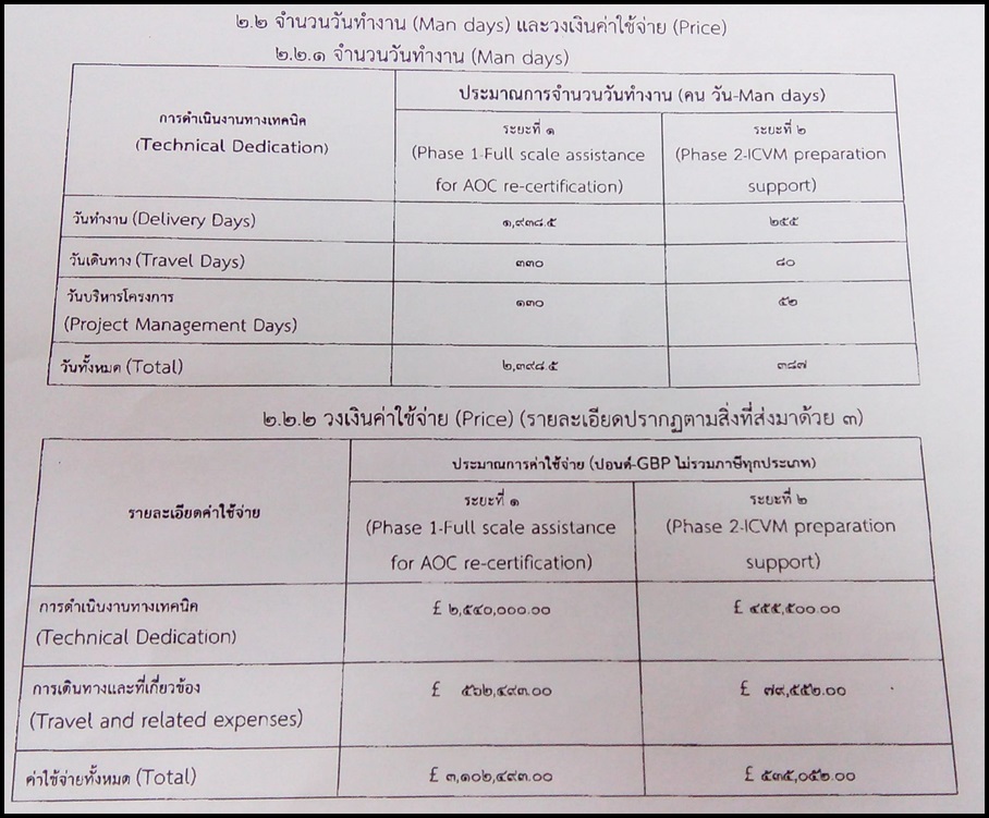 และในการว่างจ้างผู้เชี่ยวชาญจากต่างประเทศร่วมดำเนินการตรวจสอบให้คำปรึกษา และเสนอทางในการตรวจสอบ เพื่อออกใบรับรองผู้ดำเนินการเดินอากาศ กรอบวงเงินกว่า 185 ล้านบาท (อัตราแลกเปลี่ยน 1 ปอนด์ เท่ากับ 51 บาท)