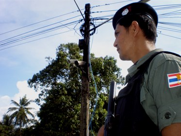 บรรยายภาพ : เจ้าหน้าที่กำลังตรวจสอบความเสียหายของกล้องโทรทัศน์วงจรปิดที่ถูกคนร้ายลอบเผาทำลายในพื้นที่ อ.สายบุรี จ.ปัตตานี เมื่อวันที่ 19 ส.ค.2554