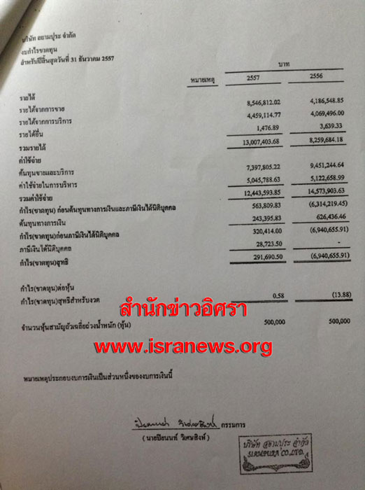 แต่ข้อเท็จจริงที่สำนักข่าวอิศรา www.isranews.org ตรวจสอบพบคือ รายได้ของบริษัท สยามปุระฯ ในช่วงปี 2557 มีกำไรเพียง 2.9 แสนบาท ส่วนในปี 2556 ขาดทุนถึง 6.9 ล้านบาท