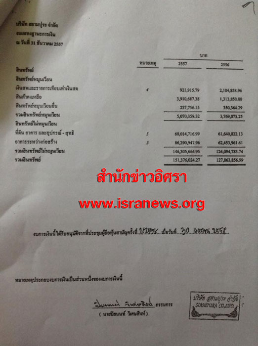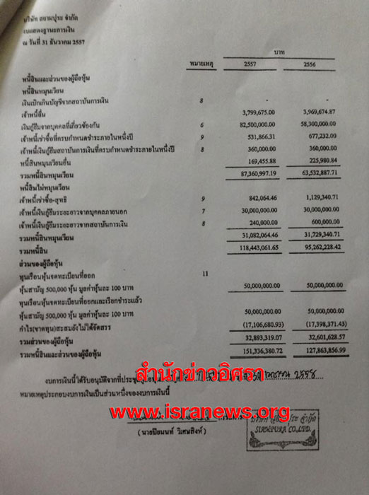 มีสินทรัพย์ทั้งสิ้น 127,863,856 บาท มีหนี้สินทั้งสิ้น 95,262,228 บาท โดยมีหนี้สินจากการกู้ยืมกรรมการบางราย ไม่มีการคิดดอกเบี้ย และคืนเมื่อทวงถามถึง 58.3 ล้านบาท (ดูเอกสารประกอบ)