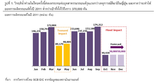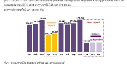 ขณะที่คาดว่าค่ายรถยนต์ส่วนใหญ่น่าจะกลับมาผลิตได้เกือบ 100% ภายในช่วงต้นปี 2012 โดยไทยยังคงเป้าผลิตรถยนต์ในปีหน้าที่ 2 ล้านคัน ปัญหา supply chain น่าจะส่งผลกระทบต่อการผลิตและการส่งออกรถยนต์ของไทยเพียงระยะสั้นๆเท่านั้น โดยคาดว่าโรงงานรถยนต์ส่วนใหญ่น่าจะกลับมาเริ่มเดินเครื่องผลิตได้เต็มที่อีกครั้งในช่วงต้นปี 2012 และสามารถกลับคืนสู่ภาวะปกติได้ภายในช่วงไตรมาสแรกยกเว้นเพียงโรงงานผลิตรถยนต์ของค่ายฮอนด้าซึ่งตั้งอยู่ในนิคมอุตสาหกรรมโรจนะและได้รับผลกระทบโดยตรงที่คาดว่าจะกลับมาผลิตได้ในช่วงไตรมาสสองเป็นต้นไป