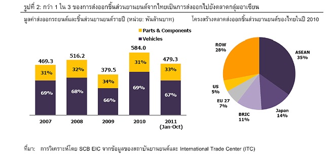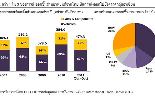 โดยกว่า 1ใน 3 เป็นการส่งออกไปยังตลาดกลุ่มนี้จากแรงหนุนที่ค่ายรถยนต์ยักษ์ใหญ่ของโลกใช้อาเซียนเป็นฐานการผลิตและส่งออก นอกจากนี้ค่ายรถยนต์หลายแห่งยังใช้ไทยเป็นศูนย์กลางการผลิตรถยนต์และชิ้นส่วนเพื่อป้อนโรงงานประกอบรถยนต์ทั่วโลก จึงไม่น่าแปลกใจที่ค่ายรถยนต์หลายแห่งทั่วโลกจำเป็นต้องประกาศลดกำลังการผลิตลงเนื่องจากปัญหาขาดแคลนชิ้นส่วนต่างๆ จากไทย