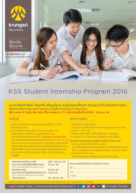 บมจ.หลักทรัพย์กรุงศรี – KSS ขอเชิญน้อง ๆนักศึกษาระดับปริญญาตรีชั้นปีที่ 2 ขึ้นไป เข้าร่วมโครงการ KSS Student Internship Program 2016 เรียนรู้การลงทุนในตลาดทุนอย่างเป็นระบบ 9 วันเต็ม ฟรี ตลอดโครงการ สมัครได้ตั้งแต่วันนี้ ถึง 30 เมษายน 2559 เริ่มการอบรม 20 - 30 มิถุนายน 2559 สอบถามรายละเอียดเพิ่มเติมได้ที่ 0 2659 7000 ต่อ 5558 คุณกานต์ธิดา หรือ www.krungsrisecurities.com