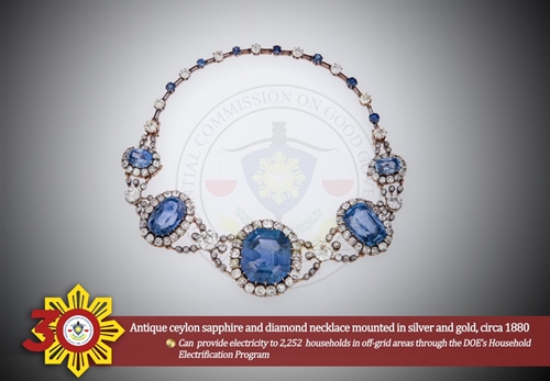 สร้อยคอไพลินล้อมเพชรของโบราณ เปรียบเทียบกับการจ่ายกระแสไฟฟ้าให้บ้านเรือนได้มากกว่า 2 พันครัวเรือน ( can provide eletricity to 2,252 households in off-grid areas through the DOE's Household Electrification Program)
