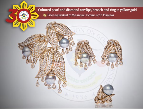 ชุดต่างหูมุกล้อมเพชร สีทองเหลืองอร่าม มูลค่าเท่ากับรายได้คนฟิลิปปินส์ 15 คนทำงานมาตลอดทั้งปี ( Set of pearl and diamond gold, equivalent to the annual income of 15 Filipinos)