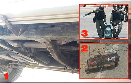 3 ระเบิดแสวงเครื่องที่ประกอบใส่ถังแก๊ส ซุกรถกระบะที่คนร้ายปล้นจากบันนังสตา แล้วบังคับให้เจ้าของรถนำไปจอดกลางเมืองยะลา ก่อนเจ้าหน้าที่เก็บกู้ไว้ได้สำเร็จ