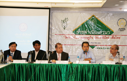 เมื่อวันที่ 1 พ.ค. 54 สมาคมนักข่าวนักหนังสือพิมพ์แห่งประเทศไทย ร่วมกับ สถาบันอิศรา มูลนิธิพัฒนาสื่อมวลชนแห่งประเทศไทย จัดกิจกรรมราชดำเนินเสวนา โครงการร่วมปฏิรูปประเทศไทย ครั้งที่ 5/2554 “วิพากษ์นโยบายเศรษฐกิจ ประชาธิปัตย์ – เพื่อไทย” โดยมี นายกอร์ปศักดิ์ สภาวสุ ประธานคณะกรรมการยุทธศาสตร์และนโยบายเพื่อการเลือกตั้ง พรรคประชาธิปัตย์ ,นายพิชัย นริพทะพันธุ์ อดีตรัฐมนตรีช่วยว่าการกระทรวงการคลังและคณะทำงานด้านเศรษฐกิจ พรรคเพื่อไทย, รศ.ดร.มนตรี โสคติยานุรักษ์ คณะรัฐประศาสนศาสตร์ สถาบันบัณฑิตพัฒนบริหารศาสตร์ (นิด้า), ผศ.ดร.ธนวรรธน์ พลวิชัย ผอ.ศูนย์พยากรณ์เศรษฐกิจและธุรกิจ มหาวิทยาลัยหอการค้าไทย ร่วมเสวนา โดยมีนายปกป้อง จันวิทย์ อาจารย์คณะเศรษฐศาสตร์ มหาวิทยาลัยธรรมศาสตร์ เป็นผู้ดำเนินรายการ