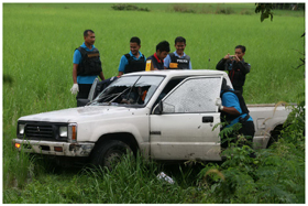 2 เจ้าหน้าที่กำลังเก็บหลักฐานที่รถกระบะของ ร.ต.ท.ญาติ รักษ์สิริ ตำรวจ สภ.ลำใหม่ จ.ยะลา ที่ถูกคนร้ายยิงถล่มจนบุตรและภรรยาเสียชีวิต (ภาพโดย อะหมัด รามันห์สิริวงศ์)
