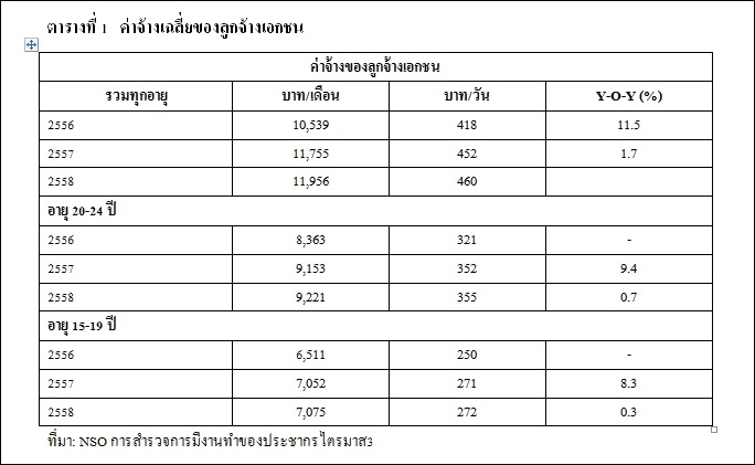 จากข้อมูลการสำรวจการมีงานทำของประชากรไตรมาส 3 ของสำนักงานสถิติแห่งชาติพบว่า ค่าจ้างเฉลี่ยจะยังคงเพิ่มขึ้นทุกปี โดยเฉพาะช่วงปี 2556 ถึง 2557 เพิ่มขึ้นถึง 11.5% สำหรับแรงงานโดยทุกกลุ่มอายุ ขณะที่แรงงานวัย 20-24 ปี ซึ่งส่วนใหญ่เป็นแรงงานทำงานได้ไม่นาน เงินเดือนเพิ่มขึ้น 9.7% เช่นกัน สาเหตุที่เพิ่มขึ้นค่อนข้างสูงทั้งแรงงานโดยรวมและแรงงานใหม่ ก็เนื่องจากสถานประกอบการจำนวนมากยังขึ้นค่าจ้างขั้นต่ำให้แรงงานแรกเข้ายังไม่ครบ จึงทยอยปรับขึ้นค่าจ้างค่อนข้างมาก