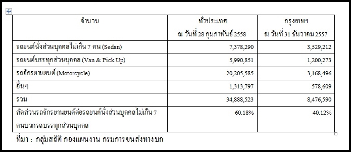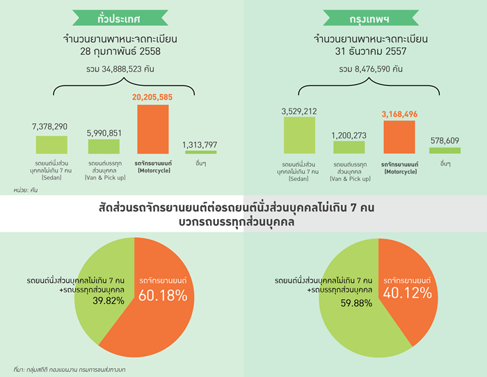 และหากพิจารณาความสำคัญของมอเตอร์ไซค์แล้ว พบว่า สัดส่วนรถจักรยานยนต์ต่อรถยนต์นั่งส่วนบุคคลไม่เกิน 7 คนบวกกับรถบรรทุกส่วนบุคคลนั้นสูงถึงร้อยละ 60 และถึงแม้พิจารณาเฉพาะกรุงเทพฯ สัดส่วนการจดทะเบียนรถจักรยานยนต์อยู่ที่ประมาณ 3 ล้านกว่าคัน หรือร้อยละ 40