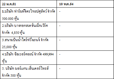 1.หุ้นบริษัท ฟาร์มพิจิตรไทยปศุสัตว์ จำกัด จำนวน 500,000 หุ้น มูลค่า 5 ล้านบาท โอนให้ นายธัญธวัช แพงไธสง อยู่บ้านเลขที่ 102/25 หมู่ที่ 8 ต.บางเลน อ.บางใหญ่ จ.นนทบุรี (ที่อยู่ตามบัญชีรายชื่อผู้ถือหุ้น) เมื่อวันที่ 13 ส.ค.52