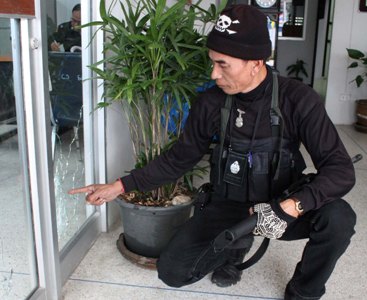 บรรยายภาพ : เจ้าหน้าที่กำลังชี้ให้ดูจุดที่ได้รับความเสียหายบนโรงพัก สภ.ลำใหม่ อ.เมือง จ.ยะลา หลังถูกคนร้ายยิงเอ็ม 79 ถล่มเข้าใส่หลายนัดเมื่อค่ำวันพุธที่ 21 ธ.ค.2554 (ภาพโดย อะหมัด รามันห์สิริวงศ์)