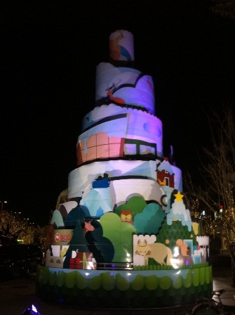 รายละเอียดของต้นคริสตมาส ขนาด: เส้นผ่านศูนย์กลาง 5 เมตร, 5 ชั้น, รวมความสูง 10 เมตร, พื้นที่ 326 ตารางเมตรวัสดุ : แผ่นพลาสติก PP Sheet (Polypropylene)ออกแบบโดย : Design Catalyst by SCG Chemicals