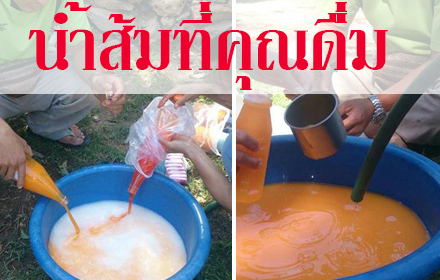 โดยเนื้อหาในข้อมูลออนไลน์ก่อนหน้านั้นระบุว่า “..ทำน้ำส้มปลอมใส่ขัณฑสกรนิดเดียวลงถังกะละมังซักผ้า แล้วเติมน้ำก๊อกผสมสีส้ม”