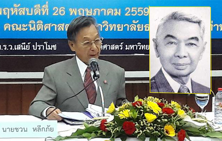 ‘นายชวน หลีกภัย’ อดีตนายกรัฐมนตรี เริ่มต้นการปาฐกถาพิเศษ เรื่อง “วิสัยทัศน์ มุมมอง ต่อศาสตราจารย์ ม.ร.ว.เสนีย์ ปราโมช” ครั้งที่ 2 ประจำปี 2559 เนื่องในโอกาสครบรอบ 111 ปี ‘ม.ร.ว.เสนีย์ ปราโมช’ อดีตนายกรัฐมนตรี 4 สมัย และอดีตหัวหน้าพรรคประชาธิปัตย์ (ปชป.) โดยมีนายอภิสิทธิ์ เวชชาชีวะ หัวหน้า ปชป. และสมาชิกพรรค ปชป. นักวิชาการ เข้าร่วม ณ คณะนิติศาสตร์ ม.ธรรมศาสตร์ (ท่าพระจันทร์)
