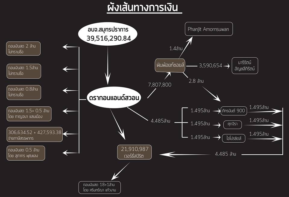 หนึ่ง การตรวจสอบเริ่มต้นจากการที่ บริษัท ดรากอนแอนด์สวอน จำกัด ได้รับเงินค่างานจาก อบจ.สมุทรปราการ จำนวน 39,516,290.84 บาท เมื่อวันที่ 5 มิ.ย.2555 จากนั้น บริษัท ดรากอนแอนด์สวอน จำกัด ได้ทำการโอนเงินต่อไปยังบุคคล 4 กลุ่ม คือ