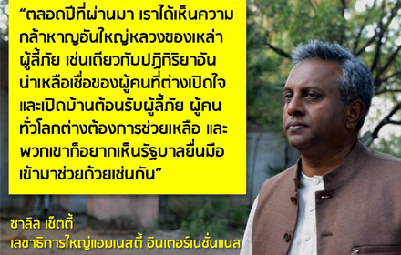 ซาลิล เช็ตตี้ เลขาธิการใหญ่แอมเนสตี้ อินเตอร์เนชั่นแนล กล่าวเนื่องใน “วันผู้ลี้ภัยโลก” (World Refugee Day) ซึ่งตรงกับวันที่ 20 มิถุนายนของทุกปี โดยระบุว่าในช่วงปีที่ผ่านมา ผู้คนมากมายทั่วโลกได้ออกมาต้อนรับและช่วยเหลือผู้ลี้ภัยที่หนีภัยสงครามและการสังหารกันอย่างล้นหลาม พร้อมชื่นชมผู้ลี้ภัยที่ใช้ความกล้าหาญอย่างมากในการเดินทางหนีออกมา