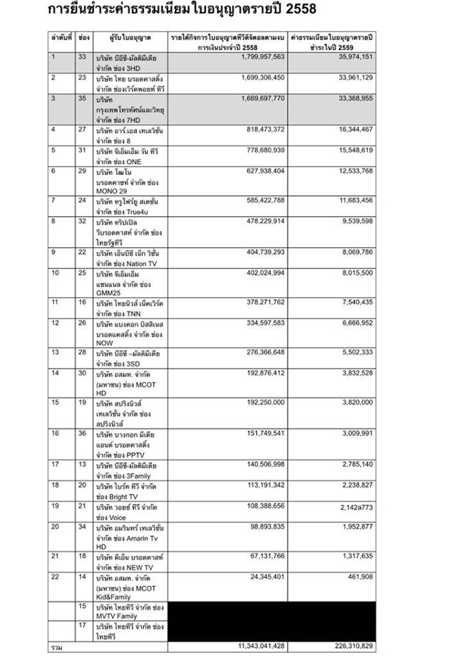 ผศ.ดร.ธวัชชัย จิตรภาษ์นันท์ คณะกรรมการกิจการกระจายเสียง กิจการโทรทัศน์ และกิจการโทรคมนาคมแห่งชาติ เปิดเผยว่า ในการประชุมคณะกรรมการกิจการกระจายเสียงและกิจการโทรทัศน์(กสท.) ครั้งที่ 20/2559 วันที่ 20 มิ.ย. 2559 นี้ มีวาระเพื่อทราบเรื่องสรุปผลการยื่นชำระค่าธรรมเนียมใบอนุญาตรายปี 2558 โดยค่าธรรมเนียมเกิดจากการนำรายได้จากการประกอบกิจการมาคำนวณ ในปี 2558 รายได้จากการประกอบกิจการทีวีดิจิตอลอยู่ที่ 11,343,041,428 บาท สามารถจัดเก็บค่าธรรมเนียมได้ จำนวน 226,310,829 บาท (สองร้อยยี่สิบหกล้านสามแสนหนึ่งหมื่นแปดร้อยยี่สิบเก้าบาท) เป็นรายได้จาก 22 ช่อง ยกเว้น บริษัท ไทยทีวี จำกัด ทั้ง 2 ช่อง คือ ช่องรายการ MVTV Family และช่องรายการไทยทีวี