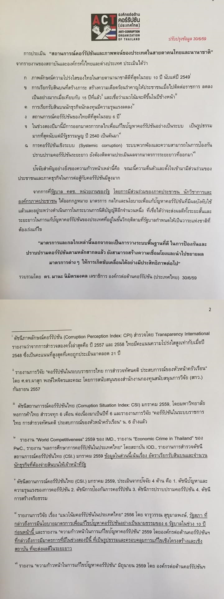 ACT ชี้ภาพลักษณ์ความโปร่งใสไทยในสายตานานาชาติ ดีสุดในรอบ 10 ปี