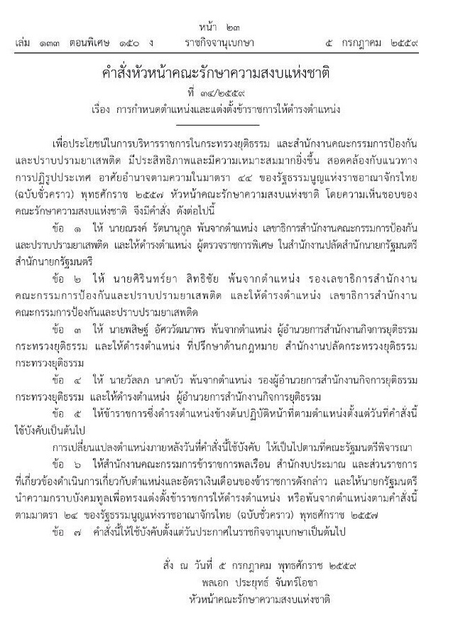 วันที่ 5 กรกฎาคม พลเอกประยุทธ์ จันทร์โอชา หัวหน้าคณะรักษาความสงบแห่งชาติ มีคำสั่ง ที่ 34/2559 เรื่องการกำหนดตำแหน่งข้าราชการให้ดำรงตำแหน่ง เพื่อประโยชน์ในการบริหารราชการในกระทรวงยุติธรรม และสำนักคณะกรรมการป้องกันและปราบปรามยาเสพติด มีประสิทธิภาพและมีความเหมาะสมยิ่งขึ้น สอดคล้องกับแนวการปฏิรูปประเทศ อาศัยอำนาจมาตรา 44 ของรัฐธรรมนูญแห่งราชอาณาจักรไทย (ฉบับชั่วคราว) พุทธศักราช 2557 หัวหน้าคณะรักษาความสงบแห่งชาติ โดยความเห็นชอบของคณะรักษาความสงบแห่งชาติ จึงมีคำสั่ง ดังต่อไปนี้