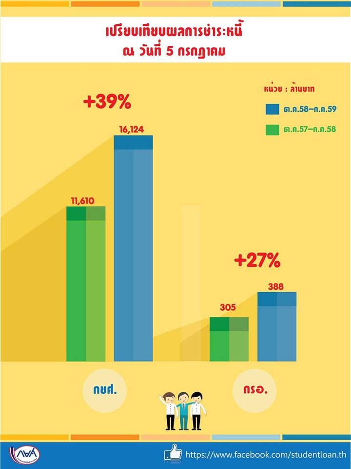 ดร.ฑิตติมา วิชัยรัตน์ ผู้จัดการกองทุนให้กู้ยืมเพื่อการศึกษา เปิดเผยผลการชำระหนี้กองทุน กยศ. และกองทุน กรอ. ณ วันที่ 5 กรกฎาคม 2559 ซึ่งเป็นวันครบกำหนดชำระหนี้ที่ผ่านมาว่า ขณะนี้มีผู้กู้ยืม กยศ. มาชำระหนี้แล้ว เป็นเงิน 16,124 ล้านบาท ซึ่งเพิ่มขึ้นมากกว่าปีที่ผ่านมา 39% และมีผู้กู้ยืม กรอ. มาชำระหนี้แล้วเป็นเงิน 388 ล้านบาท ซึ่งเพิ่มขึ้นจากเดิมคิดเป็น 27%