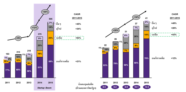 ธุรกิจสตาร์ทอัพในเอเชีย โดยเฉพาะจีนเป็นคลื่นลูกใหม่แห่งการลงทุน และมีโอกาสแซงหน้าเจ้าตลาดอย่างอเมริกาเหนือได้ในอนาคต จุดเด่นที่สำคัญอย่างหนึ่งของธุรกิจนี้ ซึ่งแตกต่างจาก SMEs คือ สามารถสร้างการเติบโตได้ในอัตราสูง รวมถึงเป็นหนึ่งในผู้ผลักดันให้เกิด disruptive technology ทำให้ช่วงที่ผ่านมา ธุรกิจสตาร์ทอัพสามารถดึงดูดเม็ดเงินลงทุนจากนักลงทุนทั่วทุกมุมโลก ถึงแม้ว่าในช่วงเริ่มต้นจะยังไม่สามารถสร้างรายได้หรือมีกำไรเป็นกอบเป็นกำ แต่ด้วยแนวคิดและศักยภาพในการเติบโตที่จะมาแทนที่ธุรกิจแบบเดิม ทำให้ธุรกิจสตาร์ทอัพได้รับเงินลงทุนปริมาณมาก โดยในปี 2014 มีเงินลงทุนสูงถึง 3.75 แสนล้านดอลลาร์สหรัฐฯ เติบโต 72% จากปีก่อนหน้า และสูงมากขึ้นเป็นประวัติการณ์ถึง 5.05 แสนล้านดอลลาร์สหรัฐฯ ในปี 2015 ทั้งนี้ นับว่าปริมาณเงินลงทุนดังกล่าวขยายตัวสูงขึ้นมากจากช่วงก่อนหน้าอย่างเห็นได้ชัด จากเดิมที่เงินลงทุนช่วงปี 2011 - 2013 มีมูลค่าเฉลี่ยเพียงปีละ 2.04 แสนล้านดอลลาร์สหรัฐฯ และขยายตัวโดยเฉลี่ยเพียง 9% ต่อปี ยิ่งไปกว่านั้น ปริมาณเงินลงทุนต่อดีล (deal) ยังเพิ่มขึ้นอีกด้วย จากเฉลี่ย 6.9 ล้านดอลลาร์สหรัฐฯ ในปี 2013 เป็น 12.5 ล้านดอลลาร์สหรัฐฯ ในปี 2015 (รูปที่ 1)