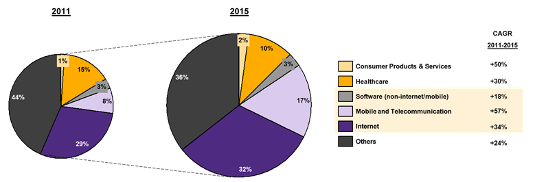 เม็ดเงินลงทุนปริมาณมหาศาลจากทั่วทุกมุมโลกหลั่งไหลไปยังกลุ่มสตาร์ทอัพที่ดำเนินธุรกิจด้าน internet และ mobile and telecommunication เนื่องจากสามารถเติบโตได้ในอัตราสูง สตาร์ทอัพที่มีโอกาสเติบโตสูง คือ tech startup ที่พึ่งพาเทคโนโลยีเพื่อช่วยการทำซ้ำและขยายขนาด โดยกลุ่มดังกล่าวสามารถดึงดูดเม็ดเงินลงทุนเกินกว่าครึ่งของปริมาณเงินลงทุนทั้งหมด นอกจากนี้ ยังพบว่าส่วนใหญ่ดำเนินธุรกิจเกี่ยวข้องกับ internet และ mobile and telecommunication โดยสตาร์ทอัพที่ดำเนินธุรกิจด้าน internet ที่ได้รับความนิยมสูงสุดจากนักลงทุน ส่วนใหญ่ประกอบธุรกิจ internet software เช่น Sprinklr ซึ่งผลิต social software platform ให้กับบริษัทต่างๆ นอกจากนี้ ยังมี สตาร์ทอัพที่ดำเนินธุรกิจด้าน internet services เช่น Dropbox ที่ให้บริการฝากไฟล์แบบออนไลน์ โดยผู้ใช้บริการสามารถเข้าถึงข้อมูลได้จากทุกที่ที่มีอินเทอร์เน็ต รวมถึง สตาร์ทอัพที่ดำเนินธุรกิจ e-commerce อย่าง Jet.com และ Snapdeal ที่ทำหน้าที่เป็น marketplace ให้ผู้ใช้บริการสามารถซื้อขายผ่านช่องทางออนไลน์ และสตาร์ทอัพที่ได้รับความนิยมจากนักลงทุนเพิ่มขึ้นสูงสุดถึง 57% โดยเฉลี่ยในช่วงปี 2011-2015 คือ กลุ่มที่ดำเนินธุรกิจด้าน mobile and telecommunication ซึ่งกลุ่มนี้มักดำเนินธุรกิจด้าน mobile software เช่น IronSource ที่สร้างแพลตฟอร์มและเครื่องมือให้แก่ผู้พัฒนาแอพพลิเคชั่น รวมทั้งที่ทำธุรกิจด้าน mobile services อย่าง Garena ซึ่งให้บริการที่หลากหลายบนโทรศัพท์มือถือ เช่น เกม โปรแกรมแชท (รูปที่ 2)