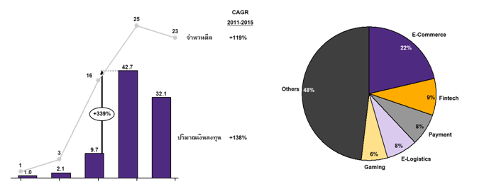 รูปที่ 4: ปริมาณเงินลงทุนและจำนวนดีลในไทย และจำนวนดีลรายประเภทธุรกิจระหว่างปี 2011-2015 การลงทุนในสตาร์ทอัพไทย ซึ่งส่วนใหญ่ดำเนินธุรกิจ e-commerce ร้อนแรงขึ้นอย่างเห็นได้ชัดในปี 2014
