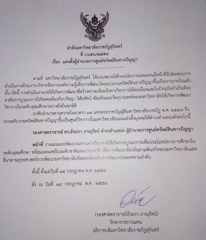 รก.อธิการฯ มรภ.สุรินทร์ ตั้งตัวเองนั่ง ผอ.ศูนย์ทรัพย์สินทางปัญญา หลังโดน ม.44 เพียง 1 วัน