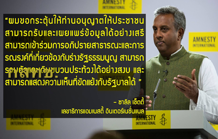ก่อนการลงประชามติในวันที่ 7 สิงหาคม 2559และในระหว่างการปฏิบัติตามแผนขั้นตอนอื่น ๆ เพื่อการเปลี่ยนผ่านทางการเมือง แอมเนสตี้อินเตอร์เนชั่นแนล ขอเรียกร้องรัฐบาลของท่านให้ใช้มาตรการที่ควรใช้มานานแล้วก่อนหน้านี้เพื่อให้ประกันว่าประชาชนสามารถใช้สิทธิมนุษยชนของตนได้อย่างสงบและเสรีโดยไม่ต้องหวาดกลัวกับการถูกคุกคามการจับกุมโดยพลการ การควบคุมตัวหรือการด าเนินคดี โดยเฉพาะอย่างยิ่ง ผมขอกระตุ้นให้ท่านอนุญาตให้ประชาชนสามารถรับและเผยแพร่ข้อมูลได้อย่างเสรี สามารถเข้าร่วมการอภิปรายสาธารณะ และการรณรงค์ที่เกี่ยวข้องกับร่างรัฐธรรมนูญ สามารถรวมตัวและเดินขบวนประท้วงได้อย่างสงบ และสามารถแสดงความเห็นที่ขัดแย้งกับรัฐบาลได้นอกจากนั้น ยังควรเปิดโอกาสให้สื่อมวลชนสามารถตีพิมพ์เผยแพร่ข้อมูลข่าวสารอย่างเสรี และเผยแพร่ความเห็นที่หลากหลาย รวมทั้งเสียงวิพากษ์วิจารณ์ต่อร่างรัฐธรรมนูญ โดยไม่ต้องหวาดกลัวว่าจะถูกลงโทษ